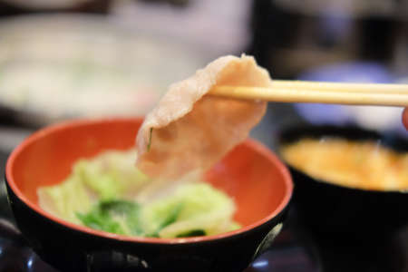 Chopsticks held by a hand, taking a slice of beef into a simmering shabu pot, creating a delicious meal experience.