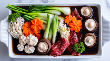 A captivating top-down view of a Japanese shabu shabu hotpot, featuring an array of fresh vegetables, mushrooms, and meats arranged beautifully for a communal dining experience.