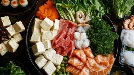 A detailed shot of a shabu-shabu setup, with various ingredients like tofu, leafy greens, and seafood arranged around a hot pot, emphasizing the vibrant colors and textures.