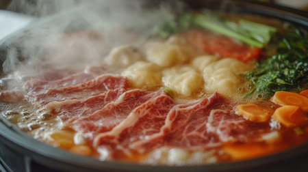 Enjoy a vibrant scene of a sizzling Japanese hotpot filled with thinly sliced meat and fresh vegetables, creating a warm and inviting dining experience.