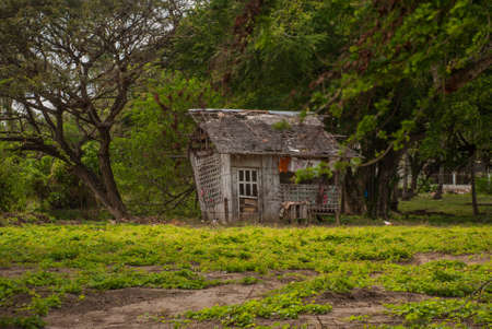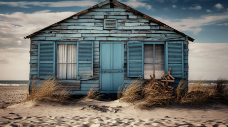 An aged, blue wooden house stands on a sandy beach, featuring a rustic design. The image showcases a hammock, weathered textures, and a natural composition. Palm trees and a cloudy sky suggest an outdoor, tropical environment. Suitable for various commercial and editorial applications requiring scenic imagery.
