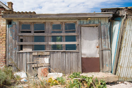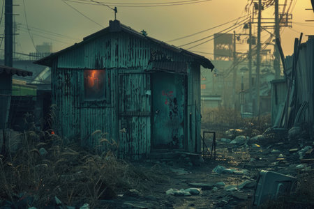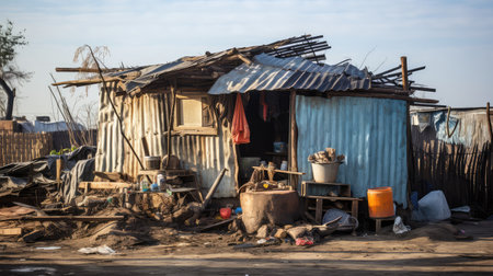 dilapidated poverty housing illustration corrugated metal, wooden roof, caving holes dilapidated poverty housing
