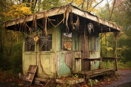 dilapidated ticket booth with cobwebs, created with generative ai