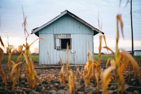 lonely wooden shack seen between cornstalks