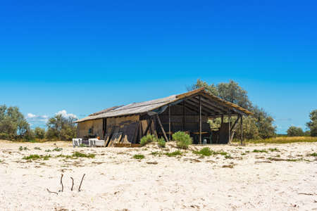 Old hut made of wood and reed by the sea.
