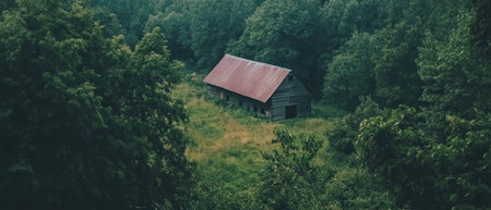 Rustic barn surrounded by lush greenery captured from above in vivid contrast colors