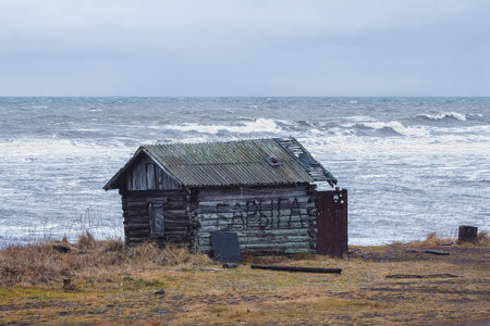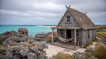 A weathered wooden cabin stands on a rocky coastline, featuring a thatched roof and a small porch. The image showcases a muted color palette with shades of gray and brown dominating the scene, complemented by vibrant turquoise water. Ideal for commercial applications, the composition provides a serene atmosphere.