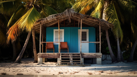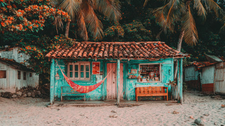 A charming blue and brown hut, featuring a red hammock, stands on a sandy beach. The composition showcases a tranquil scene with palm trees in the background. The image, bathed in warm natural light, evokes a sense of relaxation, suitable for travel or lifestyle content and commercial uses.