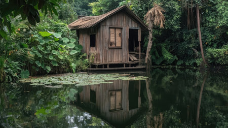 Experience a serene setting with a rustic wooden cottage beside still waters, surrounded by lush greenery, perfect for relaxation and reflection.
