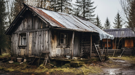 An abandoned rustic house stands surrounded by a foggy landscape, evoking a sense of solitude and decay. The weathered structure and overgrown surroundings create a moody atmosphere.