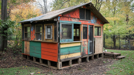 A chicken coop made from recycled materials, showcasing creative design with painted wooden pallets and old windows