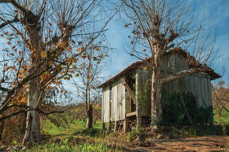 Rural autumn landscape with a small shabby shack next to leafless plane trees, in a vineyard near Bento Goncalves. A friendly country town in southern Brazil famous for its wine production.