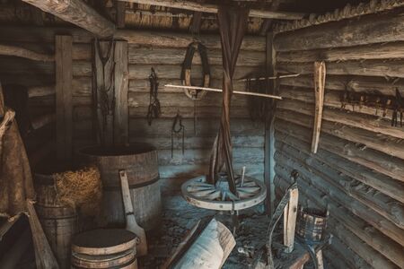 Household in the village of russia. Handmade household tools in the yard. Lifestyle of old people.