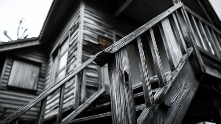 Rustic, weathered wooden building exterior with prominent stairs and railing. Features deep wood grain texture and a monochrome aesthetic.