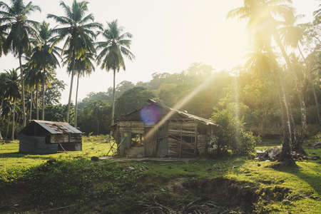Low angle view, old wooden and zinc huts mounted on a barren brown mound among green rice paddies with afternoon sunshine are common in rural Thai farmland.