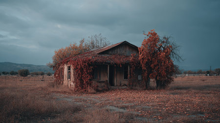 Old, weathered wooden house stands alone on a field covered in fallen autumn leaves. The house, with overgrown vines and a roof covered with reddish leaves, sits in a rural setting with a serene sky overhead.