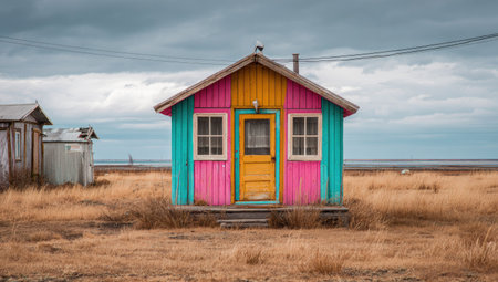 Small, brightly colored house sits in a field, facing a wide open space that leads to the ocean. The house is painted in various shades of pink, teal, and yellow. The surrounding field is dry, and the sky is overcast.