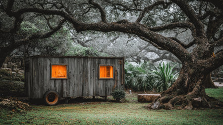 Charming, simple tiny wooden house sits amidst a lush garden, beneath the shade of large, overhanging trees. Warm light shines through the windows of the home.