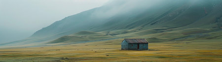 A panoramic view of a small, solitary cabin set in a vast, yellowed grassland under a cloudy sky. The distant mountains and minimalistic scenery evoke a sense of isolation and tranquility, ideal for themes of solitude and escape into nature.