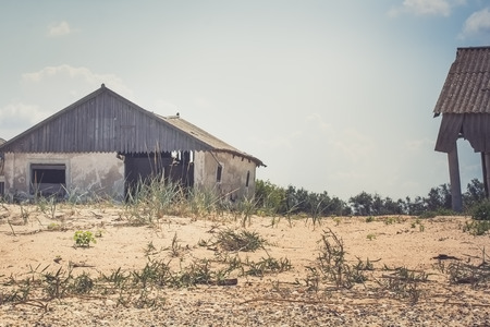 Ruined house and barn on an abandoned farm, vintage. Photo toned