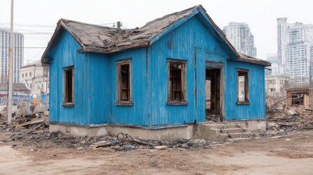 A striking image of an abandoned blue wooden house with a weathered exterior, surrounded by debris in an urban landscape, evoking feelings of neglect and decay.