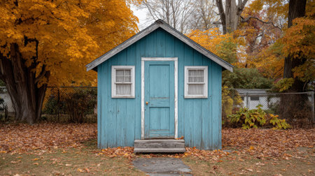 A vibrant blue garden shed sits gracefully surrounded by a beautiful autumn landscape, where colorful leaves blanket the ground, creating a serene outdoor retreat.