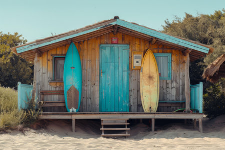 Surfer's beach shack with surfboards strewn all around Ai generated