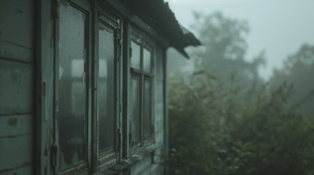 Old weathered house in misty forest setting with overgrown vegetation and rain soaked windows.