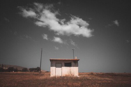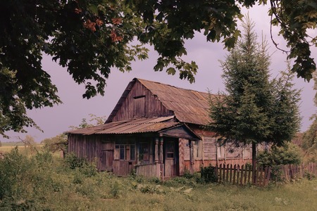 Abandoned house in the middle of the field. Retro style.