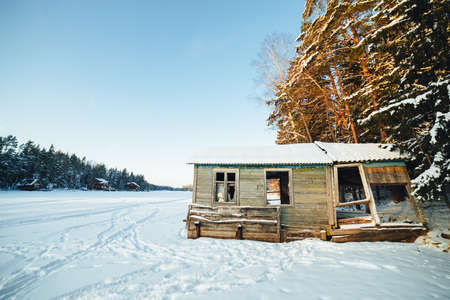 old abandoned house nearby frozen lake