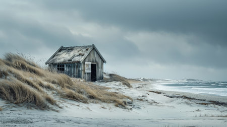 A small wooden house stands on a beach by the ocean under a cloudy sky, blending into the natural landscape with its rustic facade AIG50