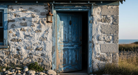 A small cottage sits atop a grassy hill overlooking the ocean. The building features a red tiled roof and light-colored walls. The image showcases a natural outdoor setting, with soft lighting and a calming color palette. Suitable for various editorial and commercial projects.