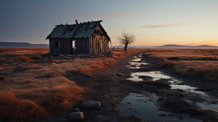 a burned down wooden cottage stands amidst a desolate landscape, captured in the ethereal style of grzegorz domaradzki. the 8k resolution photograph showcases the golden light of the australian landscape, creating an atmospheric shot that evokes a sense of haunting beauty. ai generated
