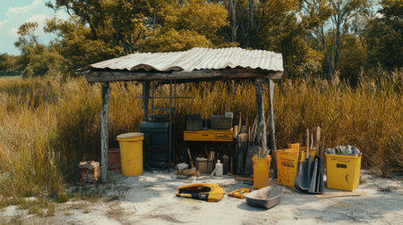 A tranquil scene featuring a rustic tool shed made of wood and metal, surrounded by tall grasses, presenting an assortment of gardening tools and equipment in a serene outdoor environment.