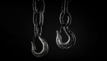 Rusty chain and hooks detail in construction setting, symbol of strength, durability and transport work