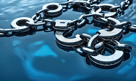 Close-up of chain on blue water. Selective focus.