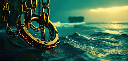 Close up view of a chain attached to a ship in the sea.