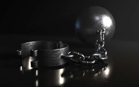 A heavy metal ball and chain with an opened shackle on an isolated dark background lit by a spotlight - 3D render