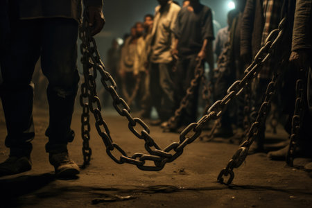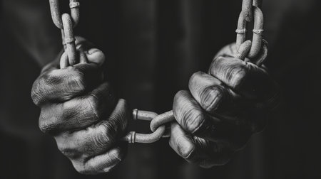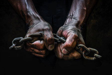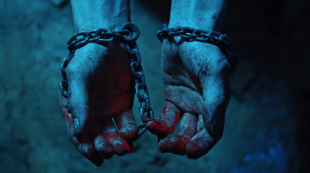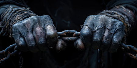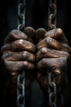Weathered hands, covered in dirt, firmly clutch rusty chains, suggesting a story of hardship. The dim lighting enhances the raw emotion and depth of the situation, reflecting a fight for freedom.