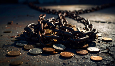 Old rusty metal chain broken in the middle, lying over a scattered pile of coins on a rough concrete floor, symbolizing breaking free from financial constraints or debt, harsh lighting