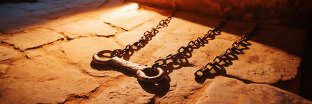 Rusty Chains on Ancient Stone Floor Dark History Background old gold iron link jail time past worn