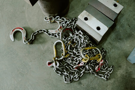 Top-down shot of chains with hooks on gray floor, part of industrial lifting equipment
