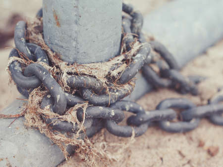 Macro shot of old rusty metal cast iron chain with old dried seaweed wound around aluminum grey post on sand shore of lake sea ocean, retro vintage film effect, cool tones, selective focus
