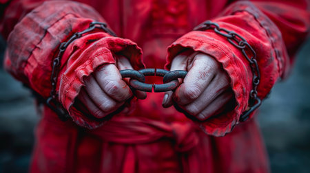 Close-up of a person holding chains in a red garment, symbolizing imprisonment and the concept of captivity. The image conveys a sense of restraint and confinement.