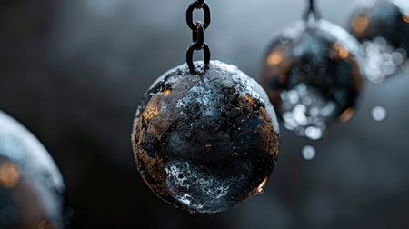 Frozen spheres hang from chains, showcasing blend of metallic and icy textures. intricate details and reflections create captivating visual, evoking sense of mystery and wonder