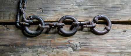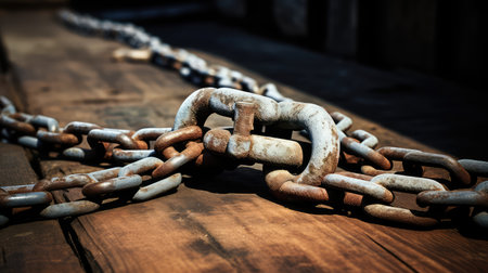 A detailed close-up image showcasing heavy metal chains positioned on a rustic surface, emphasizing their strength and industrial design.