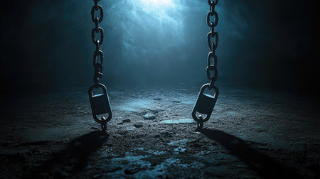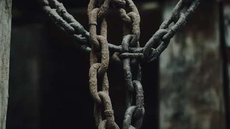 A close-up shot captures the imposing presence of heavy, rusty chains in a dark industrial setting. Dramatic lighting accentuates the metal's weathered texture, highlighting the grunge and old age of the iron links. The chains, hanging and lying on the ground, evoke themes of imprisonment, bondage, and potential freedom. This abstract image is ideal for projects exploring concepts of strength, security, and decay, with a focus on texture and detail.