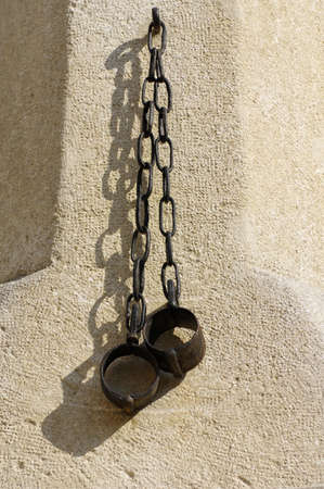 old and rusty shackles closed traditional design handcuffs hanging on a wall background