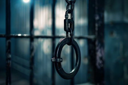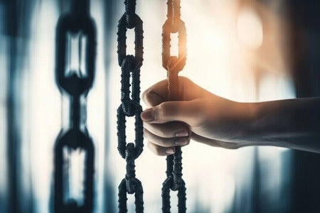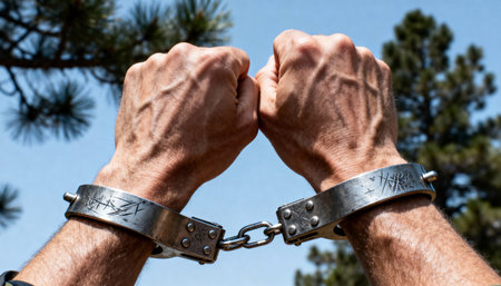 An image shows two hands, bound together by metal handcuffs, capturing a sense of restriction and imprisonment. The close-up emphasizes textured skin and the cold, metallic links of the chain. The lighting highlights the subject against a dark backdrop, potentially used for conceptual illustrations or editorial purposes.