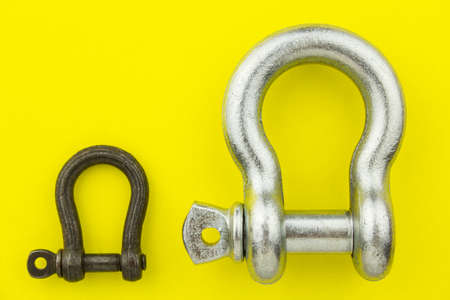 Large and small metal rigging shackles on yellow background. Professional rigging gear.
